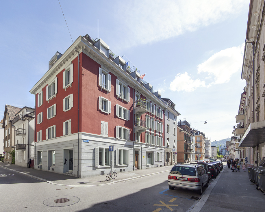 Das einzigartige Mehrfamilienhaus war über Jahrzehnte so stark vernachlässigt worden, dass eine Totalsanierung sich als effektivste Lösung anbot. Die Wogeno nutzte die Gelegenheit, ein wegweisendes ökologisches Projekt zu realisieren. DieLiegenschaft wurde umfassend renoviert, das Dachgeschoss wurde abgetragen und durch einen Holzelementbau ersetzt. Dadurch konnte zusätzlicher Wohnraum geschaffen werden. Das Gebäude erreicht somit den Minergie-Neubau-Standard.