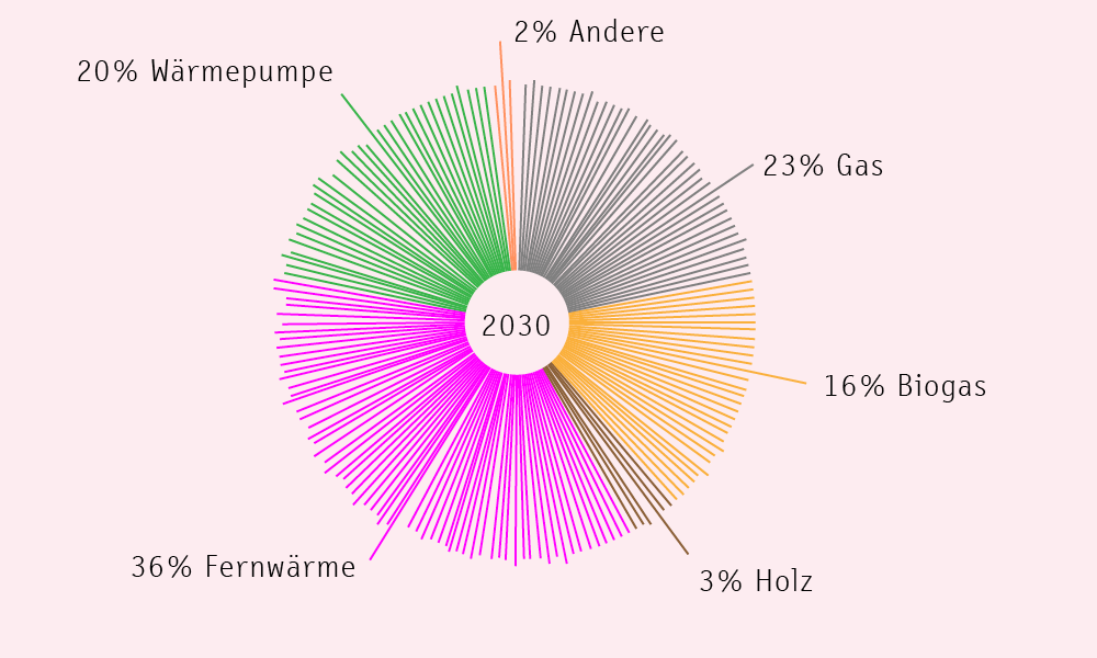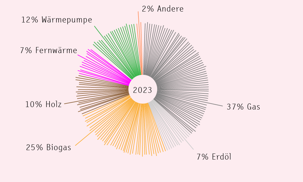 Die Energiewende wird sichtbar: Klicken Sie auf die Jahreszahlen; der Anteil der Ölheizungen nimmt kontinuierlich ab, der Anteil an Fernwärme, Wärmepumpen und Erdsonden nimmt zu.