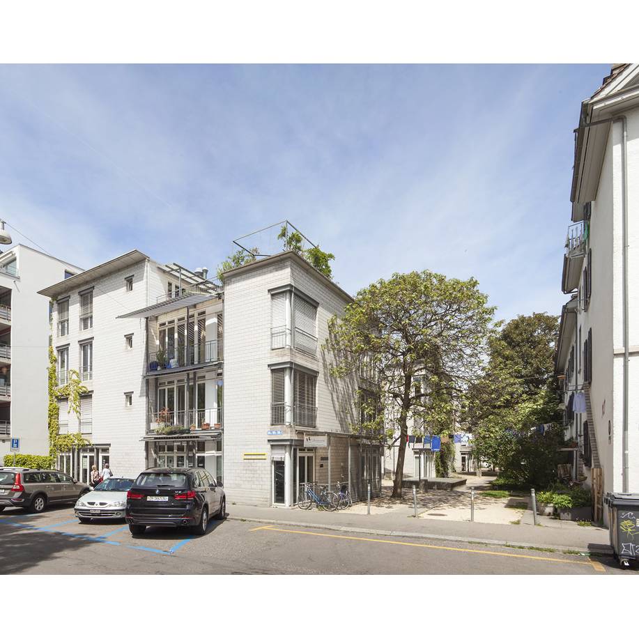 Auf dem von der Stadt Zürich im Baurecht übernommenen Gelände erstellte die Wogeno 1990 ihren ersten Neubau mit 34 Ein- bis Neun-Zimmer-Wohnungen, einem grossen Gemeinschaftsraum und 900 m² Gewerberaum. Für den Neubau wurde das Architekturbüro A.D.P. beauftragt und ist architektonich bis Heute vielbeachtet. Die Wohnungen überzeugen durch interessante Grundrisse, viel Helligkeit sowie halbprivaten und privaten Aussenräumen. Neben dem Rotpunktverlag sind dort ein Architektur- und Textbüro eingemietet, ein Grafikatelier und ein Tanzstudio nutzen die Räumlichkeiten sowie betreibt die Stadt Zürich einen Kindergarten und einen Hort.